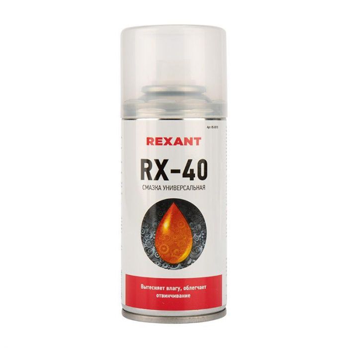 Rх-40 – полный аналог WD-40. Создан для смазывания, защиты от коррозии и облегчения отвинчивания заржавевших резьбовых соединений. Эффективно смазывает трущиеся поверхности, устраняет скрипы и заедания деталей, вытесняет влагу с различных поверхностей и электрических деталей. Очищает резиновые и пластмассовые детали. Растворяет различные нерастворимые в воде технические загрязнения, очищает следы от ржавчины и коррозии. Проникает в заклинившие и заржавевшие механизмы и разъединяет их. Не содержит силикона, не проводит электричество. Средство обладает высокой проникающей, пропитывающей и растворяющей способностью, удобно для обработки труднодоступных мест. Многофункциональное средство для универсального применения. Рабочие температуры: -40...+250 °C Диэлектрическая проницаемость: 2,2-2,4 ? Срок годности: 24 месяца Состав: алифатические растворители > 30 %, минеральное масло >30 %, ингибитор коррозии,ароматизатор, алифатический спирт, нПАВ, активные присадки <5%, углеводородный пропеллент 15-30%.